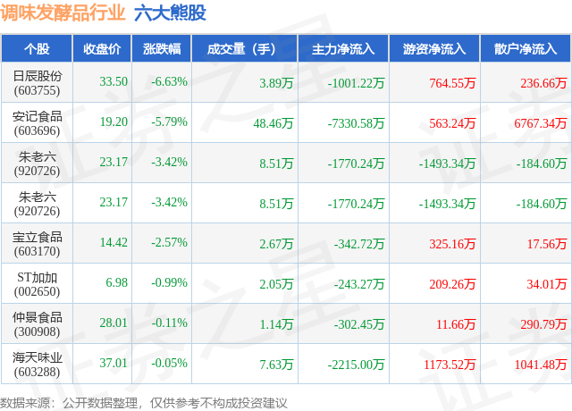 个股表现方面,调味发酵品行业当日领跌股为日辰股份(603755),该股当日报收33.5,下跌6.63%,成交量3.89万,主力资金净流出1001.22万元。安记食品(603696)以下跌5.79%紧随其后,该股当日成交量48.46万,主力资金净流出7330.58万元。除此之外,朱老六(920726)、朱老六(920726)、宝立食品(603170)均进入当日熊股之列。具体个股列表见下表: