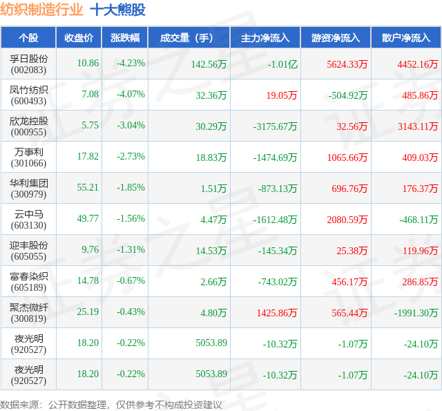 个股表现方面,纺织制造行业当日领跌股为孚日股份(002083),该股当日报收10.86,下跌4.23%,成交量142.56万,主力资金净流出1.01亿元。凤竹纺织(600493)以下跌4.07%紧随其后,该股当日成交量32.36万,主力资金净流入19.05万元。除此之外,欣龙控股(000955)、万事利(301066)、华利集团(300979)均进入当日熊股之列。具体个股列表见下表: