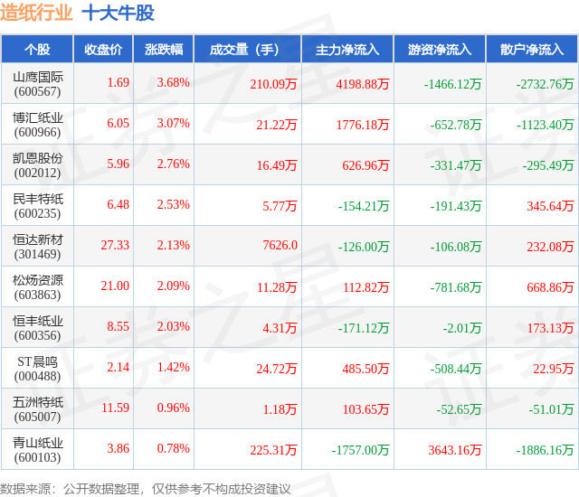个股表现方面,造纸行业当日领涨股为山鹰国际(600567),该股当日报收1.69,上涨3.68%,成交量210.09万,主力资金净流入4198.88万元。博汇纸业(600966)以上涨3.07%紧随其后,该股当日成交量21.22万,主力资金净流入1776.18万元。除此之外,凯恩股份(002012)、民丰特纸(600235)、恒达新材(301469)均进入当日牛股之列。具体个股列表见下表: