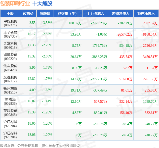 个股表现方面,包装印刷行业当日领跌股为中锐股份(002374),该股当日报收3.55,下跌3.53%,成交量108.07万,主力资金净流出2425.28万元。王子新材(002735)以下跌2.82%紧随其后,该股当日成交量53.95万,主力资金净流出1.08亿元。除此之外,金富科技(003018)、鸿博股份(002229)、集友股份(603429)均进入当日熊股之列。具体个股列表见下表: