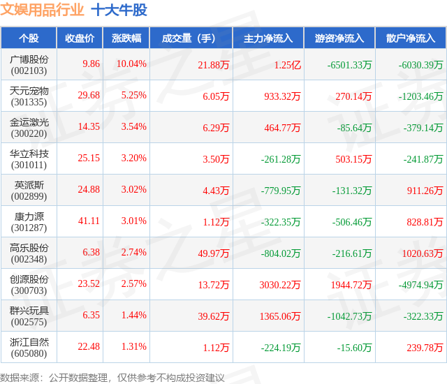 个股表现方面,文娱用品行业当日领涨股为广博股份(002103),该股当日报收9.86,上涨10.04%,成交量21.88万,主力资金净流入1.25亿元。天元宠物(301335)以上涨5.25%紧随其后,该股当日成交量6.05万,主力资金净流入933.32万元。除此之外,金运激光(300220)、华立科技(301011)、英派斯(002899)均进入当日牛股之列。具体个股列表见下表: