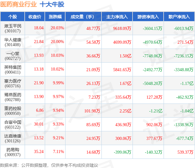 个股表现方面,医药商业行业当日领涨股为漱玉平民(301017),该股当日报收18.04,上涨20.03%,成交量48.77万,主力资金净流入9618.09万元。华人健康(301408)以上涨20.0%紧随其后,该股当日成交量54.58万,主力资金净流入4699.09万元。除此之外,一心堂(002727)、英特集团(000411)、塞力医疗(603716)均进入当日牛股之列。具体个股列表见下表:
