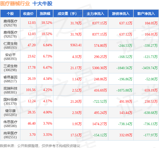 个股表现方面,医疗器械行业当日领涨股为鹿得医疗(920278),该股当日报收12.03,上涨18.52%,成交量31.78万,主力资金净流入8377.15万元。鹿得医疗(920278)以上涨18.52%紧随其后,该股当日成交量31.78万,主力资金净流入8377.15万元。除此之外,仁度生物(688193)、安必平(688393)、三诺生物(300298)均进入当日牛股之列。具体个股列表见下表: