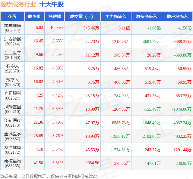 个股表现方面,医疗服务行业当日领涨股为美年健康(002044),该股当日报收6.02,上涨10.05%,成交量545.46万,主力资金净流入3.11亿元。迪安诊断(300244)以上涨8.65%紧随其后,该股当日成交量44.73万,主力资金净流入1213.48万元。除此之外,兰卫医学(301060)、数字人(920670)、数字人(920670)均进入当日牛股之列。具体个股列表见下表: