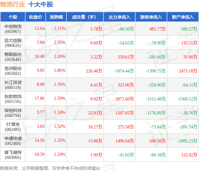 个股表现方面,物流行业当日领涨股为中创物流(603967),该股当日报收12.64,上涨2.51%,成交量5.78万,主力资金净流出96.5万元。远大控股(000626)以上涨2.35%紧随其后,该股当日成交量9.6万,主力资金净流出54.65万元。除此之外,畅联股份(603648)、龙洲股份(002682)、长江投资(600119)均进入当日牛股之列。具体个股列表见下表: