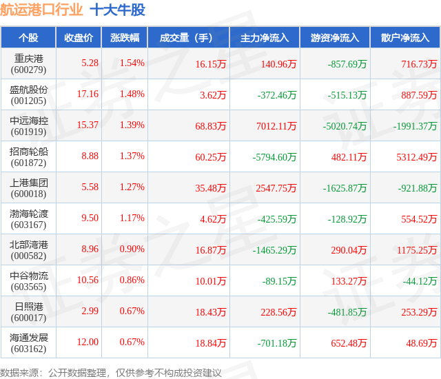 个股表现方面,航运港口行业当日领涨股为重庆港(600279),该股当日报收5.28,上涨1.54%,成交量16.15万,主力资金净流入140.96万元。盛航股份(001205)以上涨1.48%紧随其后,该股当日成交量3.62万,主力资金净流出372.46万元。除此之外,中远海控(601919)、招商轮船(601872)、上港集团(600018)均进入当日牛股之列。具体个股列表见下表: