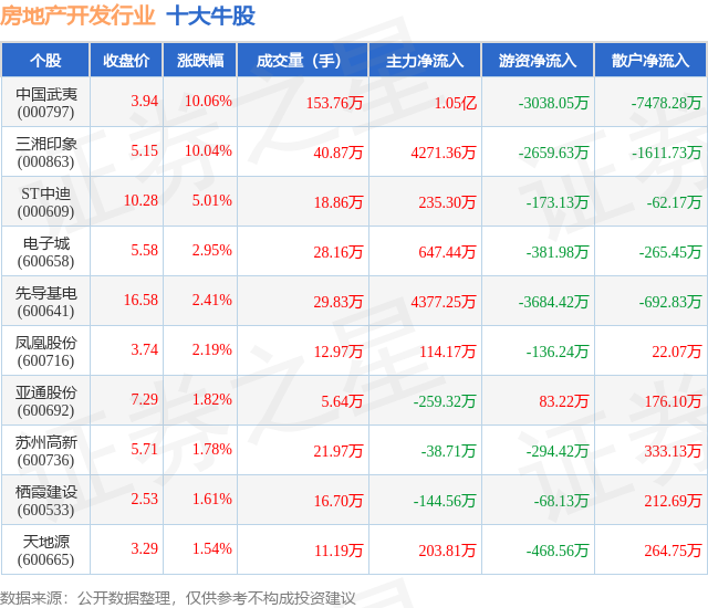 个股表现方面,房地产开发行业当日领涨股为中国武夷(000797),该股当日报收3.94,上涨10.06%,成交量153.76万,主力资金净流入1.05亿元。三湘印象(000863)以上涨10.04%紧随其后,该股当日成交量40.87万,主力资金净流入4271.36万元。除此之外,ST中迪(000609)、电子城(600658)、先导基电(600641)均进入当日牛股之列。具体个股列表见下表: