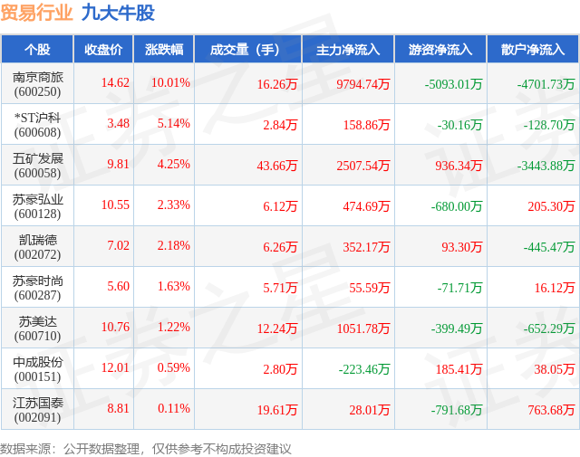 个股表现方面,贸易行业当日领涨股为南京商旅(600250),该股当日报收14.62,上涨10.01%,成交量16.26万,主力资金净流入9794.74万元。*ST沪科(600608)以上涨5.14%紧随其后,该股当日成交量2.84万,主力资金净流入158.86万元。除此之外,五矿发展(600058)、苏豪弘业(600128)、凯瑞德(002072)均进入当日牛股之列。具体个股列表见下表: