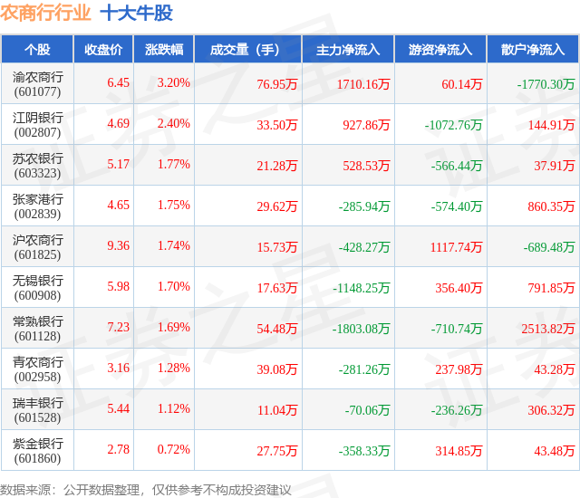 个股表现方面,农商行行业当日领涨股为渝农商行(601077),该股当日报收6.45,上涨3.2%,成交量76.95万,主力资金净流入1710.16万元。江阴银行(002807)以上涨2.4%紧随其后,该股当日成交量33.5万,主力资金净流入927.86万元。除此之外,苏农银行(603323)、张家港行(002839)、沪农商行(601825)均进入当日牛股之列。具体个股列表见下表: