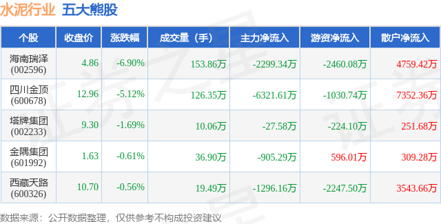 个股表现方面,水泥行业当日领跌股为海南瑞泽(002596),该股当日报收4.86,下跌6.9%,成交量153.86万,主力资金净流出2299.34万元。四川金顶(600678)以下跌5.12%紧随其后,该股当日成交量126.35万,主力资金净流出6321.61万元。除此之外,塔牌集团(002233)、金隅集团(601992)、西藏天路(600326)均进入当日熊股之列。具体个股列表见下表: