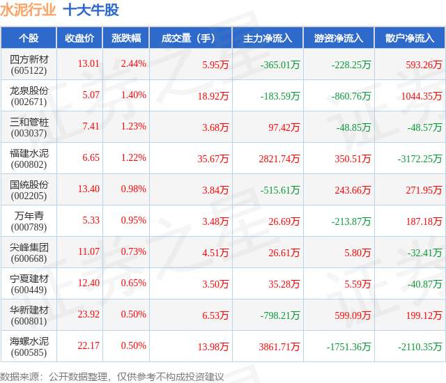 个股表现方面,水泥行业当日领涨股为四方新材(605122),该股当日报收13.01,上涨2.44%,成交量5.95万,主力资金净流出365.01万元。龙泉股份(002671)以上涨1.4%紧随其后,该股当日成交量18.92万,主力资金净流出183.59万元。除此之外,三和管桩(003037)、福建水泥(600802)、国统股份(002205)均进入当日牛股之列。具体个股列表见下表: