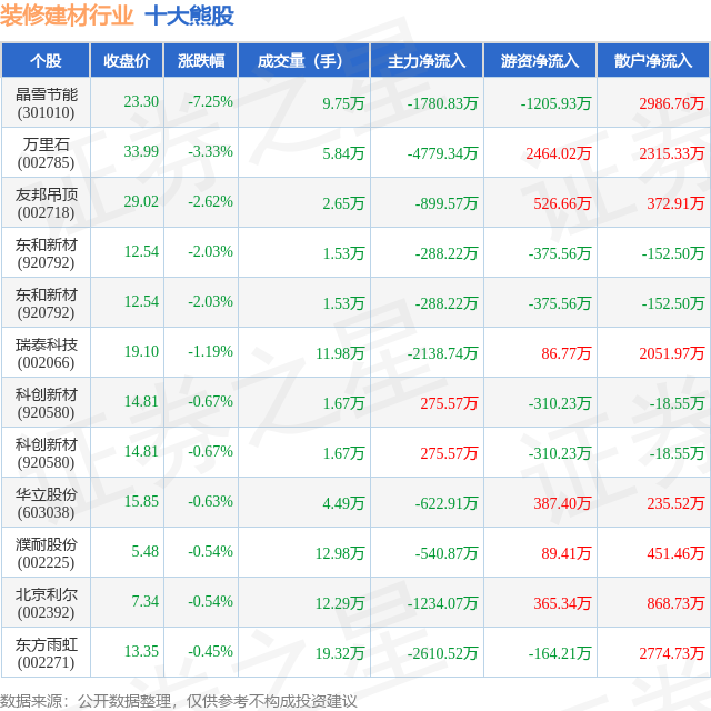 个股表现方面,装修建材行业当日领跌股为晶雪节能(301010),该股当日报收23.3,下跌7.25%,成交量9.75万,主力资金净流出1780.83万元。万里石(002785)以下跌3.33%紧随其后,该股当日成交量5.84万,主力资金净流出4779.34万元。除此之外,友邦吊顶(002718)、东和新材(920792)、东和新材(920792)均进入当日熊股之列。具体个股列表见下表: