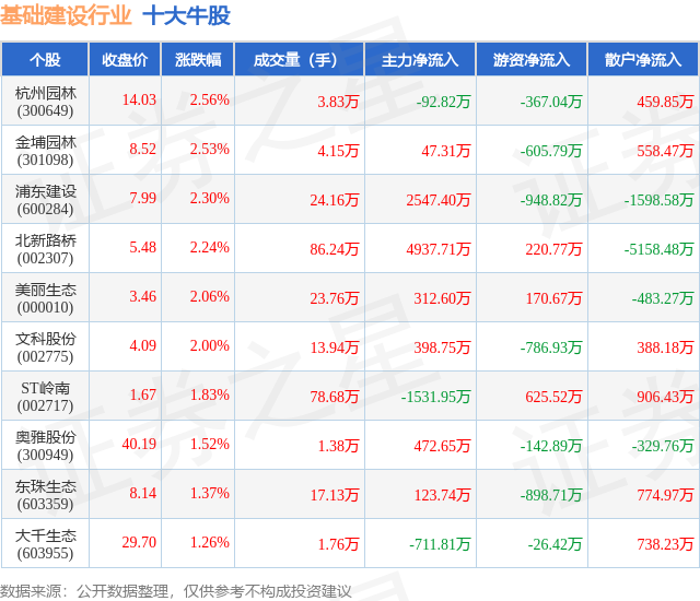 个股表现方面,基础建设行业当日领涨股为杭州园林(300649),该股当日报收14.03,上涨2.56%,成交量3.83万,主力资金净流出92.82万元。金埔园林(301098)以上涨2.53%紧随其后,该股当日成交量4.15万,主力资金净流入47.31万元。除此之外,浦东建设(600284)、北新路桥(002307)、美丽生态(000010)均进入当日牛股之列。具体个股列表见下表:
