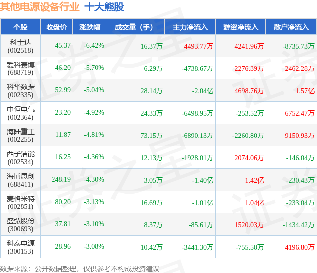 个股表现方面,其他电源设备行业当日领跌股为科士达(002518),该股当日报收45.37,下跌6.42%,成交量16.37万,主力资金净流入4493.77万元。爱科赛博(688719)以下跌5.7%紧随其后,该股当日成交量6.29万,主力资金净流出4738.67万元。除此之外,科华数据(002335)、中恒电气(002364)、海陆重工(002255)均进入当日熊股之列。具体个股列表见下表:
