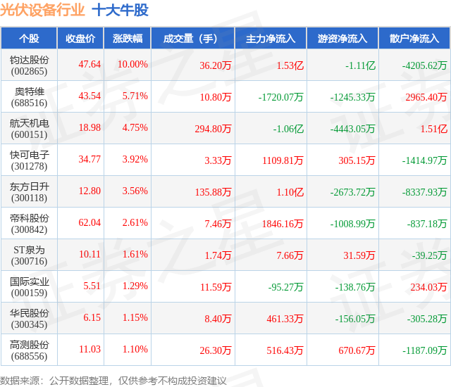 个股表现方面,光伏设备行业当日领涨股为钧达股份(002865),该股当日报收47.64,上涨10.0%,成交量36.2万,主力资金净流入1.53亿元。奥特维(688516)以上涨5.71%紧随其后,该股当日成交量10.8万,主力资金净流出1720.07万元。除此之外,航天机电(600151)、快可电子(301278)、东方日升(300118)均进入当日牛股之列。具体个股列表见下表: