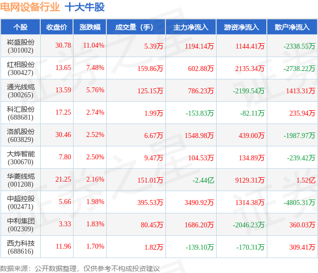 个股表现方面,电网设备行业当日领涨股为崧盛股份(301002),该股当日报收30.78,上涨11.04%,成交量5.39万,主力资金净流入1194.14万元。红相股份(300427)以上涨7.48%紧随其后,该股当日成交量159.86万,主力资金净流入602.88万元。除此之外,通光线缆(300265)、科汇股份(688681)、洛凯股份(603829)均进入当日牛股之列。具体个股列表见下表: