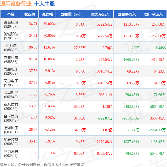 个股表现方面,通用设备行业当日领涨股为驰诚股份(920407),该股当日报收34.71,上涨30.0%,成交量8.34万,主力资金净流入5222.54万元。驰诚股份(920407)以上涨30.0%紧随其后,该股当日成交量8.34万,主力资金净流入5222.54万元。除此之外,铂力特(688333)、思看科技(688583)、同惠电子(920509)均进入当日牛股之列。具体个股列表见下表: