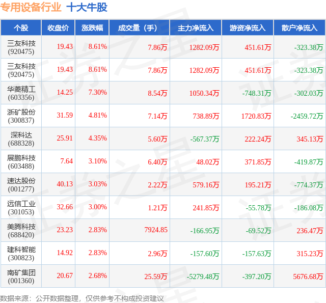 个股表现方面,专用设备行业当日领涨股为三友科技(920475),该股当日报收19.43,上涨8.61%,成交量7.86万,主力资金净流入1282.09万元。三友科技(920475)以上涨8.61%紧随其后,该股当日成交量7.86万,主力资金净流入1282.09万元。除此之外,华菱精工(603356)、浙矿股份(300837)、深科达(688328)均进入当日牛股之列。具体个股列表见下表: