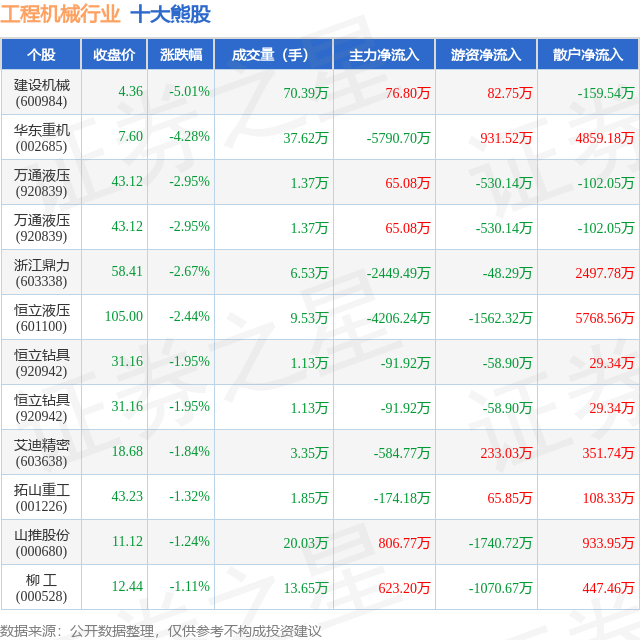 个股表现方面,工程机械行业当日领跌股为建设机械(600984),该股当日报收4.36,下跌5.01%,成交量70.39万,主力资金净流入76.8万元。华东重机(002685)以下跌4.28%紧随其后,该股当日成交量37.62万,主力资金净流出5790.7万元。除此之外,万通液压(920839)、万通液压(920839)、浙江鼎力(603338)均进入当日熊股之列。具体个股列表见下表: