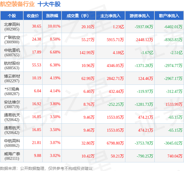 个股表现方面,航空装备行业当日领涨股为北摩高科(002985),该股当日报收30.65,上涨10.01%,成交量20.1万,主力资金净流入1.23亿元。广联航空(300900)以上涨8.5%紧随其后,该股当日成交量55.27万,主力资金净流入5915.71万元。除此之外,中航重机(600765)、航材股份(688563)、博云新材(002297)均进入当日牛股之列。具体个股列表见下表: