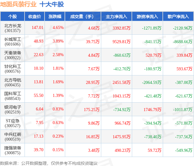 个股表现方面,地面兵装行业当日领涨股为北方长龙(301357),该股当日报收147.01,上涨4.65%,成交量4.68万,主力资金净流入3392.85万元。长城军工(601606)以上涨3.89%紧随其后,该股当日成交量39.75万,主力资金净流入9529.81万元。除此之外,天秦装备(300922)、甘化科工(000576)、北方导航(600435)均进入当日牛股之列。具体个股列表见下表: