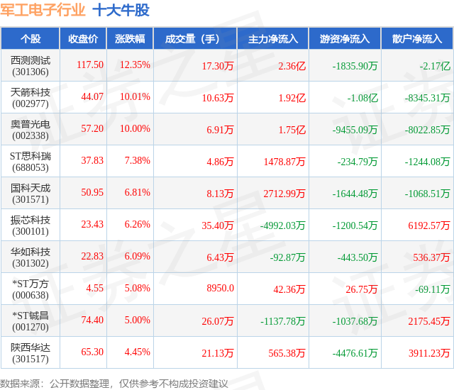 个股表现方面,军工电子行业当日领涨股为西测测试(301306),该股当日报收117.5,上涨12.35%,成交量17.3万,主力资金净流入2.36亿元。天箭科技(002977)以上涨10.01%紧随其后,该股当日成交量10.63万,主力资金净流入1.92亿元。除此之外,奥普光电(002338)、ST思科瑞(688053)、国科天成(301571)均进入当日牛股之列。具体个股列表见下表: