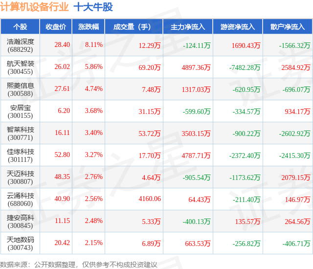 个股表现方面,计算机设备行业当日领涨股为浩瀚深度(688292),该股当日报收28.4,上涨8.11%,成交量12.29万,主力资金净流出124.11万元。航天智装(300455)以上涨5.86%紧随其后,该股当日成交量69.2万,主力资金净流入4897.36万元。除此之外,熙菱信息(300588)、安居宝(300155)、智莱科技(300771)均进入当日牛股之列。具体个股列表见下表: