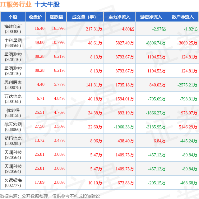 个股表现方面,IT服务行业当日领涨股为海峡创新(300300),该股当日报收16.4,上涨16.39%,成交量217.31万,主力资金净流入4.8亿元。中科星图(688568)以上涨10.79%紧随其后,该股当日成交量48.61万,主力资金净流入5827.49万元。除此之外,星图测控(920116)、星图测控(920116)、思创医惠(300078)均进入当日牛股之列。具体个股列表见下表:
