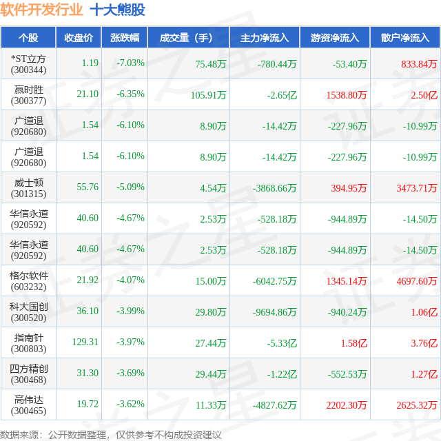个股表现方面,软件开发行业当日领跌股为*ST立方(300344),该股当日报收1.19,下跌7.03%,成交量75.48万,主力资金净流出780.44万元。赢时胜(300377)以下跌6.35%紧随其后,该股当日成交量105.91万,主力资金净流出2.65亿元。除此之外,广道退(920680)、广道退(920680)、威士顿(301315)均进入当日熊股之列。具体个股列表见下表: