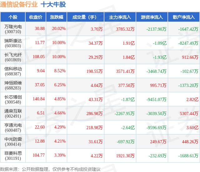 个股表现方面,通信设备行业当日领涨股为万隆光电(300710),该股当日报收30.88,上涨20.02%,成交量3.7万,主力资金净流入3785.32万元。瑞斯康达(603803)以上涨10.0%紧随其后,该股当日成交量34.37万,主力资金净流入1.91亿元。除此之外,长飞光纤(601869)、信科移动(688387)、坤恒顺维(688283)均进入当日牛股之列。具体个股列表见下表: