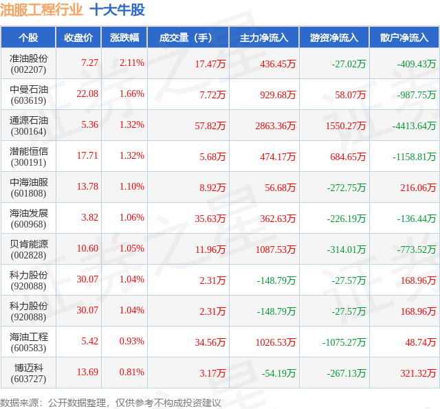 个股表现方面,油服工程行业当日领涨股为准油股份(002207),该股当日报收7.27,上涨2.11%,成交量17.47万,主力资金净流入436.45万元。中曼石油(603619)以上涨1.66%紧随其后,该股当日成交量7.72万,主力资金净流入929.68万元。除此之外,通源石油(300164)、潜能恒信(300191)、中海油服(601808)均进入当日牛股之列。具体个股列表见下表: