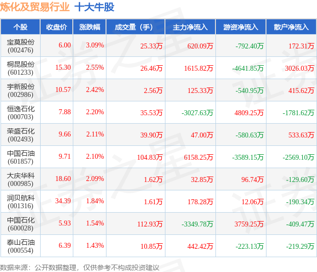 个股表现方面,炼化及贸易行业当日领涨股为宝莫股份(002476),该股当日报收6.0,上涨3.09%,成交量25.33万,主力资金净流入620.09万元。桐昆股份(601233)以上涨2.55%紧随其后,该股当日成交量26.46万,主力资金净流入1615.82万元。除此之外,宇新股份(002986)、恒逸石化(000703)、荣盛石化(002493)均进入当日牛股之列。具体个股列表见下表: