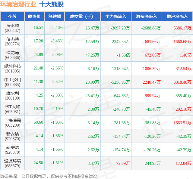 个股表现方面,环境治理行业当日领跌股为清水源(300437),该股当日报收16.57,下跌5.48%,成交量26.47万,主力资金净流出3697.29万元。倍杰特(300774)以下跌3.46%紧随其后,该股当日成交量12.59万,主力资金净流出2342.35万元。除此之外,福龙马(603686)、朗坤科技(301305)、中山公用(000685)均进入当日熊股之列。具体个股列表见下表: