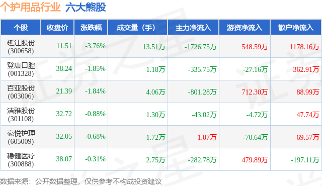 个股表现方面,个护用品行业当日领跌股为延江股份(300658),该股当日报收11.51,下跌3.76%,成交量13.51万,主力资金净流出1726.75万元。登康口腔(001328)以下跌1.85%紧随其后,该股当日成交量1.18万,主力资金净流出335.75万元。除此之外,百亚股份(003006)、洁雅股份(301108)、豪悦护理(605009)均进入当日熊股之列。具体个股列表见下表:
