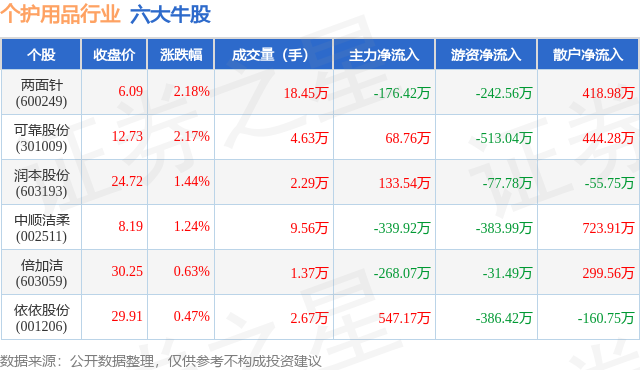 个股表现方面,个护用品行业当日领涨股为两面针(600249),该股当日报收6.09,上涨2.18%,成交量18.45万,主力资金净流出176.42万元。可靠股份(301009)以上涨2.17%紧随其后,该股当日成交量4.63万,主力资金净流入68.76万元。除此之外,润本股份(603193)、中顺洁柔(002511)、倍加洁(603059)均进入当日牛股之列。具体个股列表见下表: