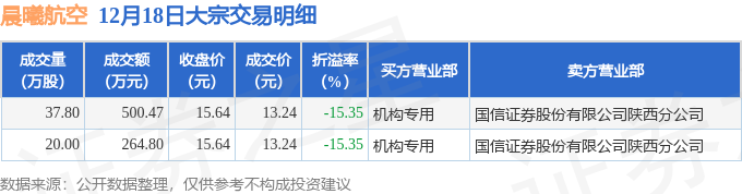证券之星消息,12月18日晨曦航空发生大宗交易,交易数据如下: