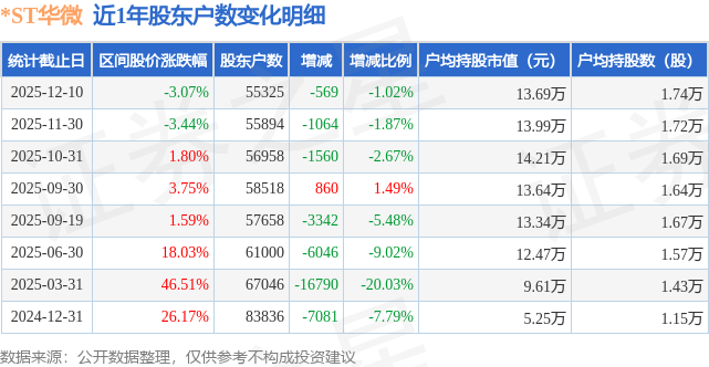 从股价来看,2025年11月30日至2025年12月10日,*ST华微区间跌幅为3.07%,在此期间股东户数减少569.0户,减幅为1.02%。