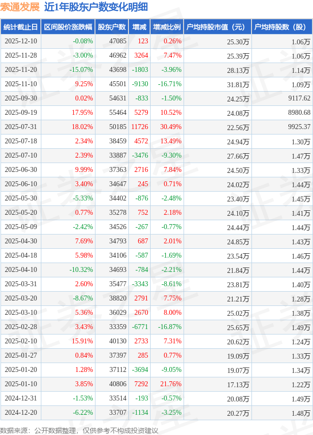 从股价来看,2025年11月28日至2025年12月10日,索通发展区间跌幅为0.08%,在此期间股东户数增加123.0户,增幅为0.26%。