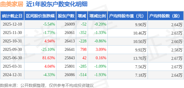 从股价来看,2025年11月30日至2025年12月10日,曲美家居区间跌幅为5.54%,在此期间股东户数减少52.0户,减幅为0.2%。