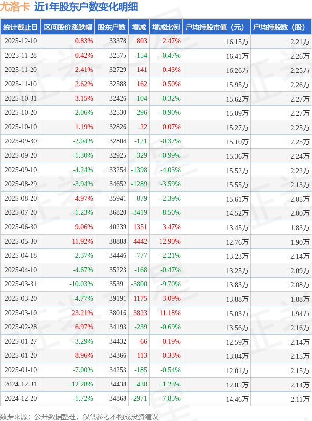 证券之星消息,近日尤洛卡披露,截至2025年12月10日公司股东户数为3.34万户,较11月28日增加803.0户,增幅为2.47%。户均持股数量由上期的2.26万股减少至2.21万股,户均持股市值为16.15万元。