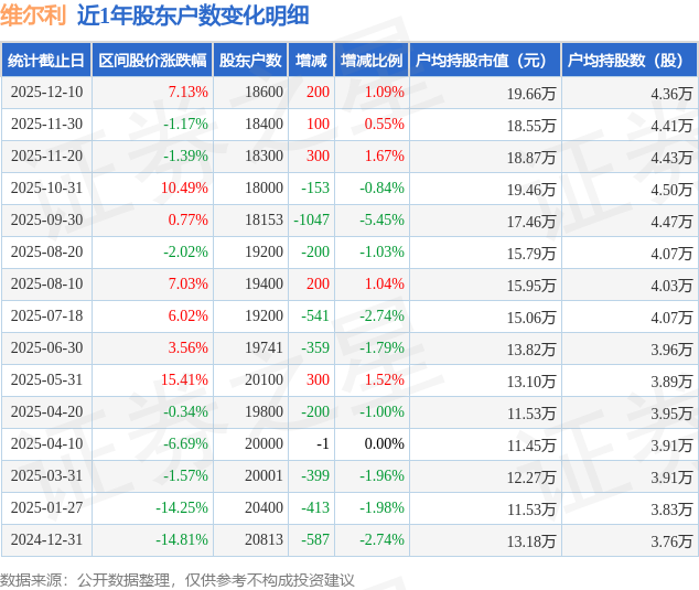 从股价来看,2025年11月30日至2025年12月10日,维尔利区间涨幅为7.13%,在此期间股东户数增加200.0户,增幅为1.09%。