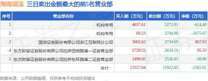 证券之星消息,沪深交易所2025年12月18日公布的交易公开信息显示,海南瑞泽(002596)因连续三个交易日内,跌幅偏离值累计达到20%的证券登上龙虎榜。此次是近5个交易日内第1次上榜。