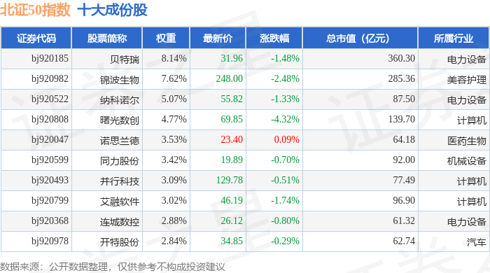 北证50(899050)指数十大成份股详情如下: