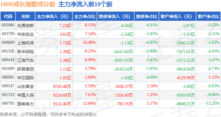 资金流向方面,180R成长(000030)指数成份股当日主力资金净流出合计58.28亿元,游资资金净流入合计12.54亿元,散户资金净流入合计45.75亿元。成份股资金流向详情见下表: