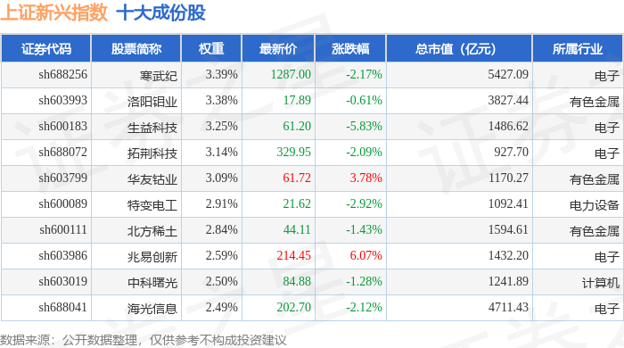 证券之星消息,12月18日,上证新兴(000067)指数报收于8531.67点,跌0.83%,成交867.34亿元,换手率0.87%。当日该指数成份股中,上涨的有10家,兆易创新以6.07%的涨幅领涨,下跌的有38家,生益科技以5.83%的跌幅领跌。