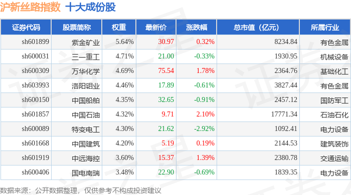 证券之星消息,12月18日,沪新丝路(000160)指数报收于2069.9点,涨0.08%,成交505.32亿元,换手率0.49%。当日该指数成份股中,上涨的有37家,亨通光电以4.29%的涨幅领涨,下跌的有30家,中国西电以5.36%的跌幅领跌。