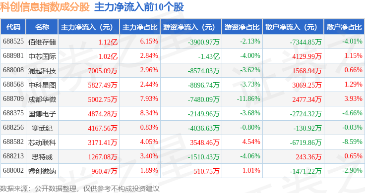 资金流向方面,科创信息(000682)指数成份股当日主力资金净流出合计13.14亿元,游资资金净流入合计5.49亿元,散户资金净流入合计7.65亿元。成份股资金流向详情见下表: