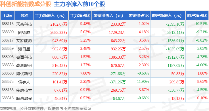 资金流向方面,科创新能(000692)指数成份股当日主力资金净流出合计4.99亿元,游资资金净流入合计3.89亿元,散户资金净流入合计1.09亿元。成份股资金流向详情见下表: