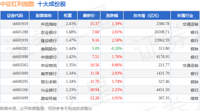 证券之星消息,12月18日,中证红利(000922)指数报收于5473.71点,涨0.81%,成交452.84亿元,换手率0.25%。当日该指数成份股中,上涨的有69家,陕西煤业以3.74%的涨幅领涨,下跌的有28家,中粮糖业以3.1%的跌幅领跌。