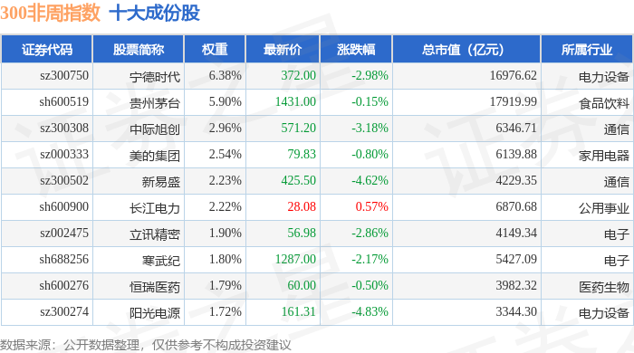 证券之星消息,12月18日,300非周(000969)指数报收于5242.09点,跌1.33%,成交2695.72亿元,换手率0.68%。当日该指数成份股中,上涨的有50家,兆易创新以6.07%的涨幅领涨,下跌的有141家,东山精密以6.22%的跌幅领跌。